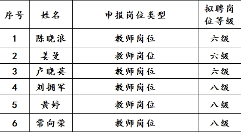 教师岗位聘用评审工作组于2022年4月13日召开会议,对通过学校复核的资格有效人员、按照学校下达的各级岗位投放数评审确定教师五级及以下岗位拟聘人选,现予以公示。