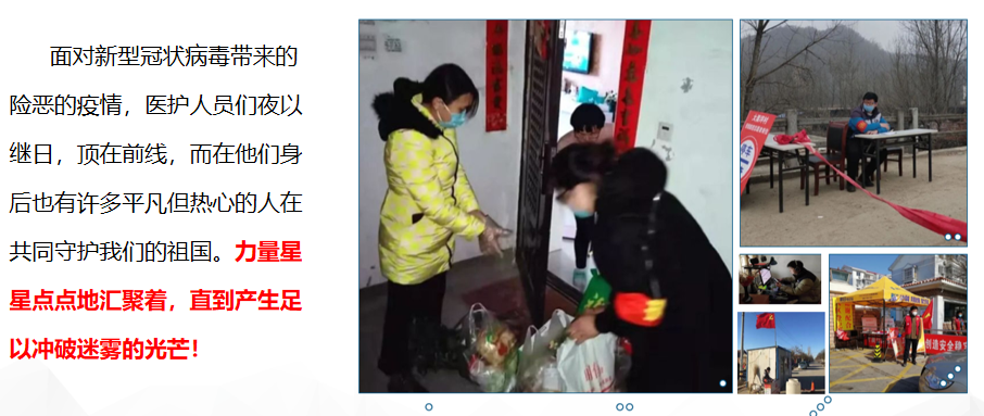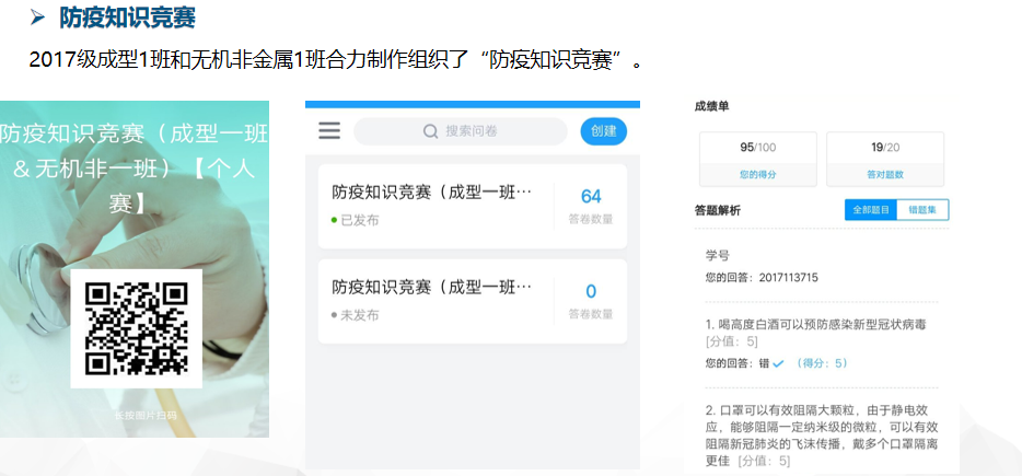 据不完全统计,17级的13位同学积极参与疫情期间的志愿行动,有的小可爱不惧严寒站岗排查,有的小可爱不辞辛苦给社区输送物资,成型1班和无机非金属1班的可爱们更是合力制作组织了“防疫知识竞赛”,为同学们分享防疫知识。力量星星点点的汇聚着,我们相信终将产生足以冲破迷雾的光芒!