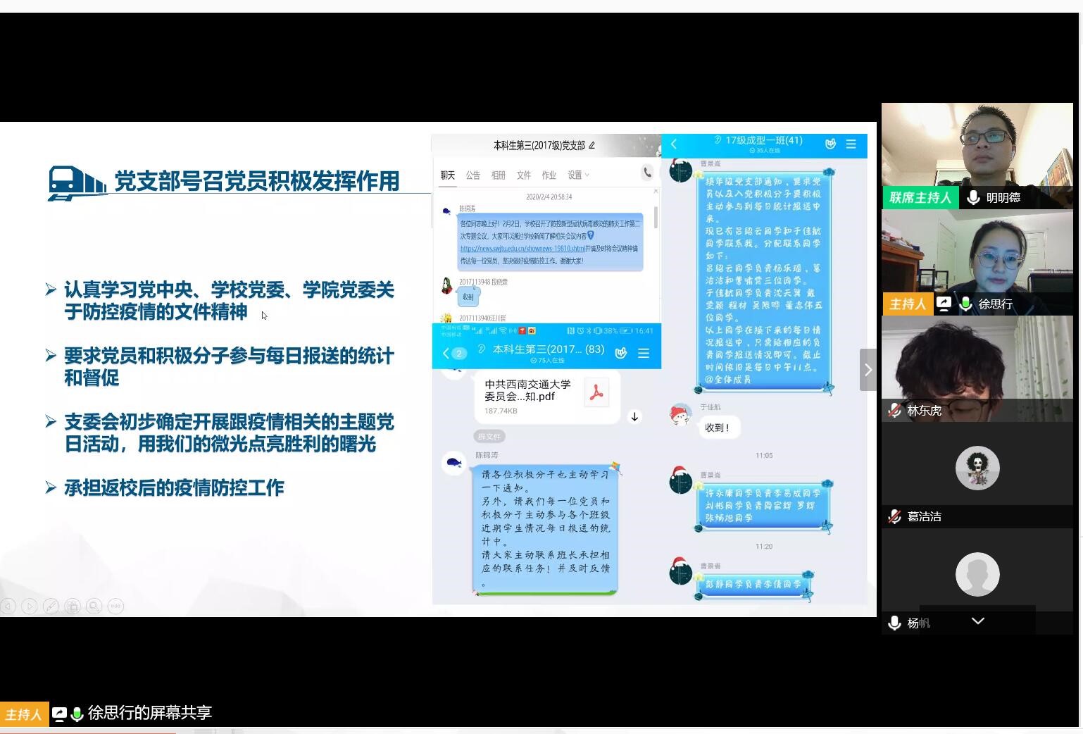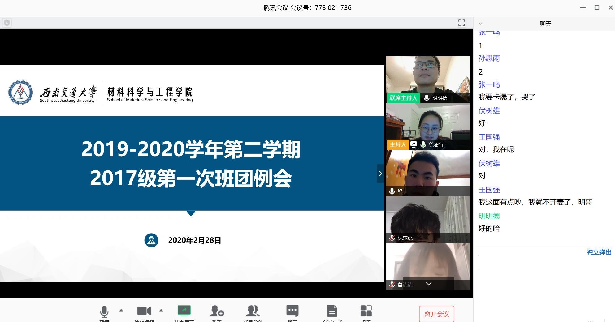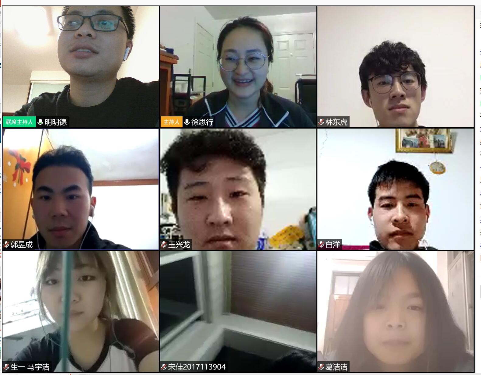 2017级线上班团例会顺利召开,辅导员黄德明老师、许欢老师与班长、团支书们第一次以这种特殊的方式“以情话疫”。