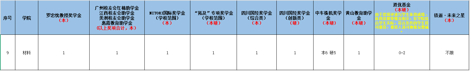 学院学校范围专项奖助学金可推荐名额分配表如下图所示;学校范围专项奖助学金评选办法见学校通知附件4。