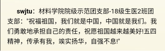 最后支部团员参与了“青春告白祖国、青春告白母校”活动,大家纷纷发布告白寄语,深情告白母校和祖国,并以2020年院级示范团支部的名义祝福祖国,体现了支部青年强烈的爱国荣校精神。