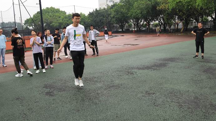团体赛分为初赛和决赛,总共有六支队伍参加。初赛为计次60s男女混合集体跳,由成绩排名前四的队伍进入决赛。团体决赛为集体跳绳100下的计时赛,赛制的设定也是为了呼应建党100周年,比赛中大家齐心协力,共同努力,最终硕士3班以2分06秒的成绩取得了第一名,硕士1班和5班的混合队获得了第二名,第三名则是硕士4班的队伍。