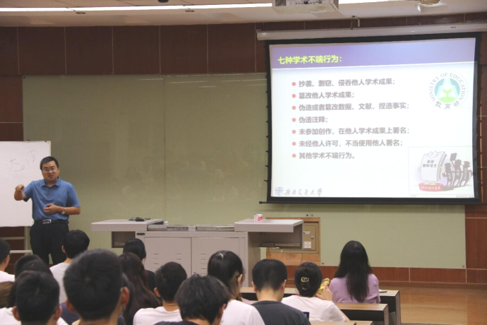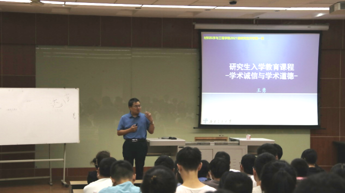 王勇教授主讲。本次活动旨在加强研究生学术诚信教育,强化学生诚信意识,营造良好的学术氛围;并让同学们了解到学术研究的底线,必须严格坚守学术诚信,自觉抵制学术造假行为。