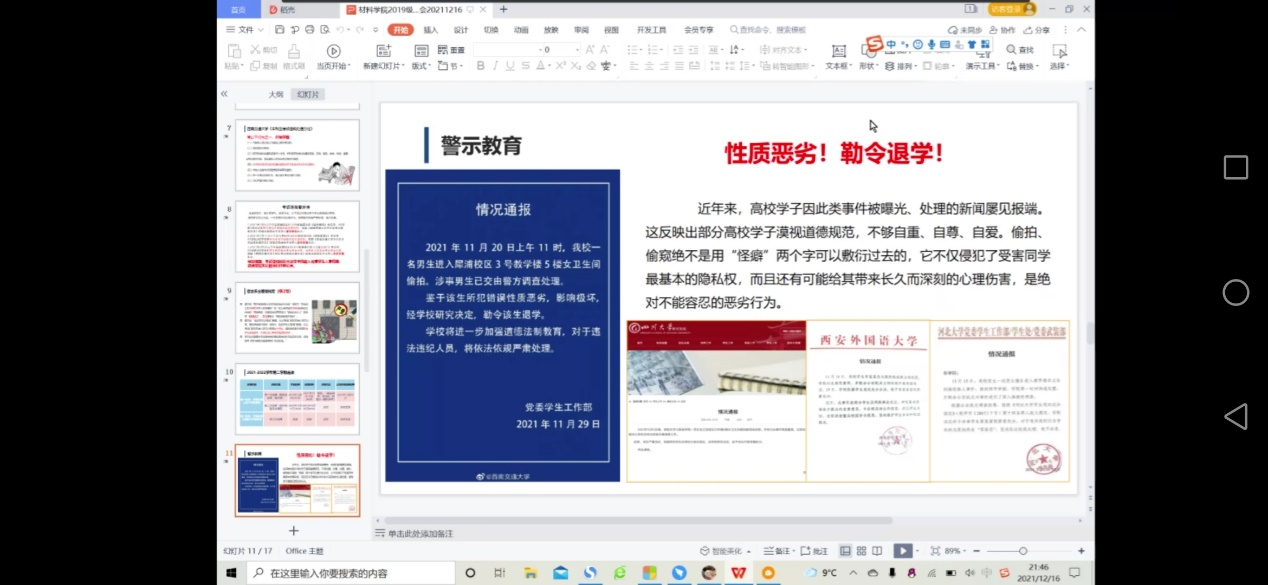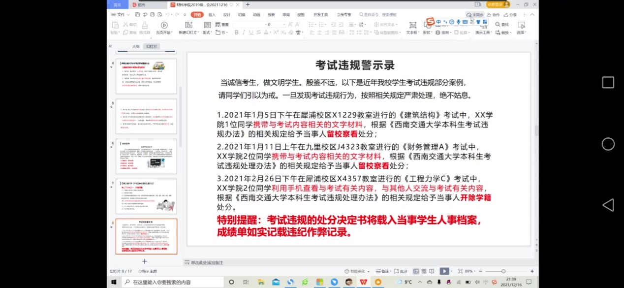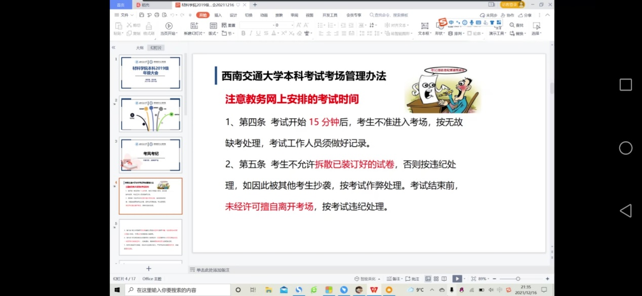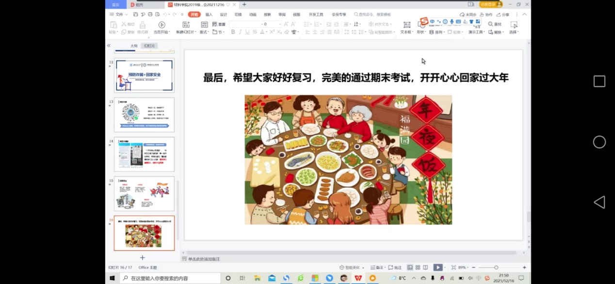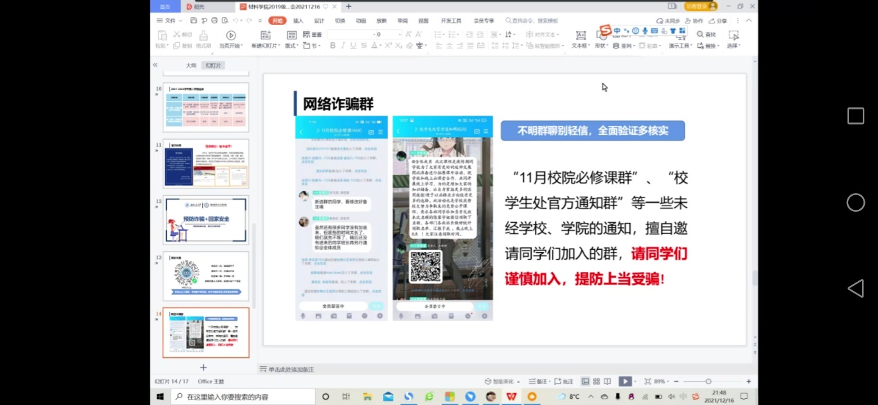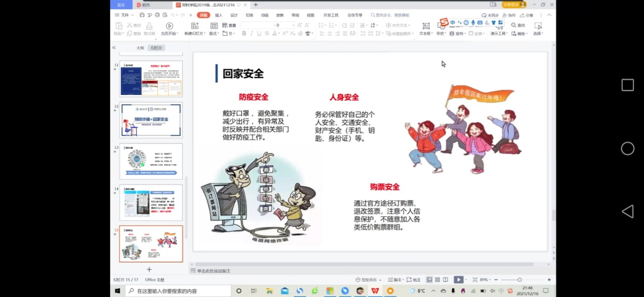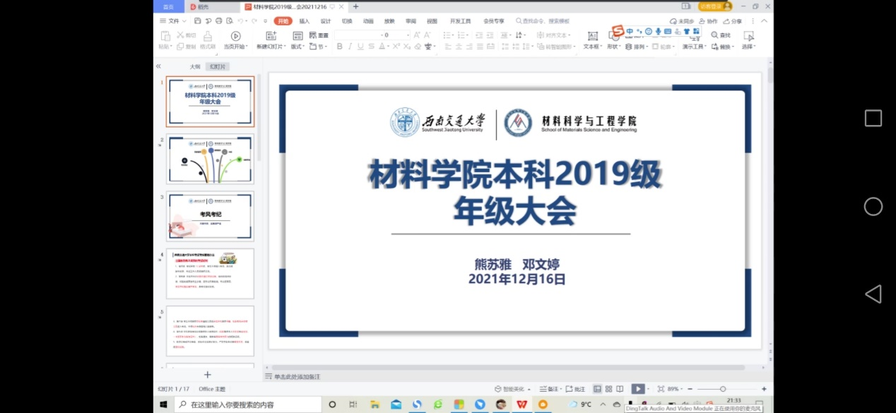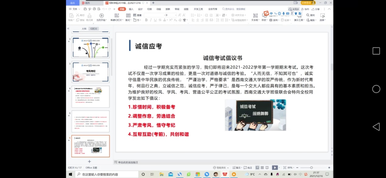 本科2019级2021-2022学年第六次年级大会于2021年12月16日晚21:30在钉钉平台顺利召开。旨在加强诚信考试教育、防疫安全、网络电信诈骗安全、返乡安全、强调宿舍管理事项。2019级本科全体同学参与大会,2019级辅导员邓文婷、熊苏雅出席并主持。