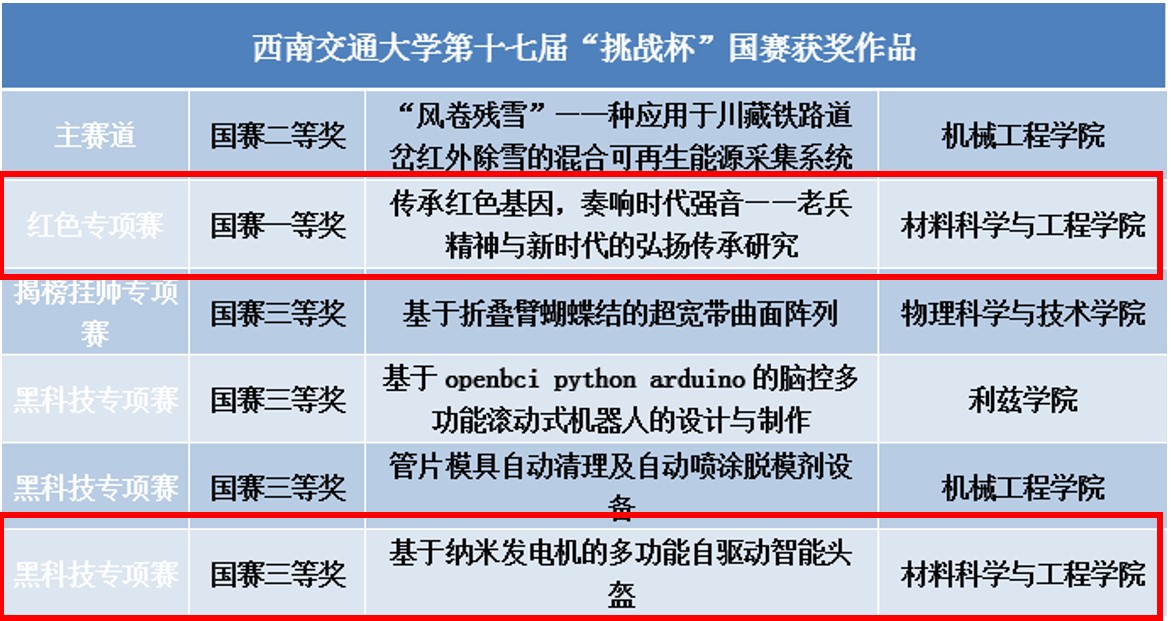 选送的《传承红色基因,奏响时代强音——老兵精神与新时代的弘扬传承研究》从全国10000余件作品激烈角逐中脱颖而出荣获红色专项赛全国一等奖,《基于纳米发电机的多功能自驱动智能头盔》荣获黑科技专项赛全国三等奖,取得色情文学