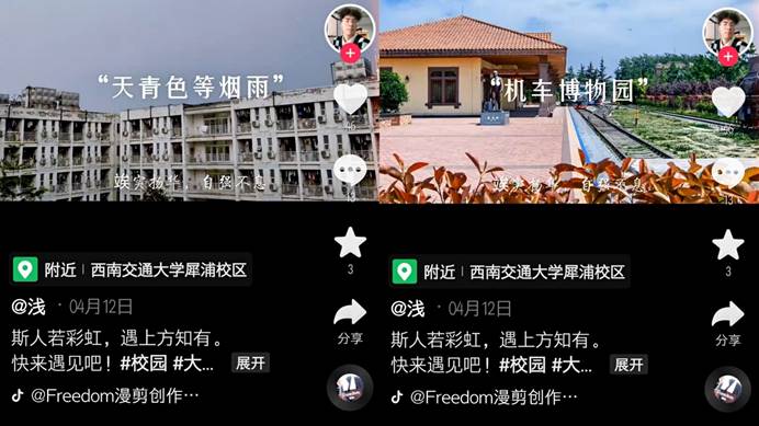 同学们的作品富有创意,各具特色,呈现了交大的最美春光。有红灿灿的暖阳,湛蓝的天空,风中摇曳的嫩绿树梢,明亮而富有生机的机车博物园,翩翩起舞的交大萌宠黑天鹅……一帧帧的精美画面带我们一起感受交大的春天。正如选手所说:“寒冬再长,春天也会到来。四月,我满了新的一岁。春天的交大,充斥着忙碌,又充满着快乐和自由,春天的气息悄无声息地沁人心脾。”