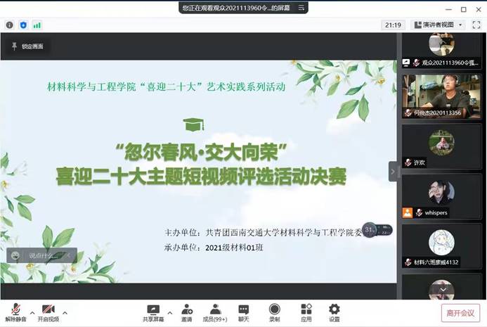 团委主办,材料类2021-01班承办的 “忽尔春风·交大向荣——喜迎党代会·献礼二十大”主题短视频评选活动决赛如期举办。出席本次活动的评委嘉宾有:色情文学