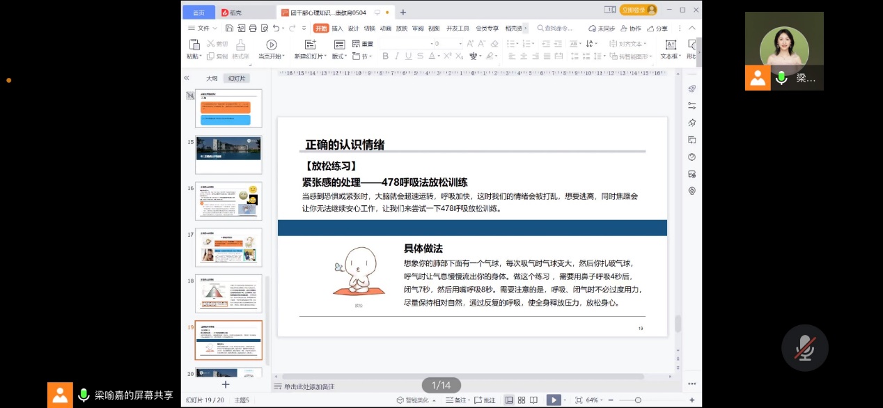 青年讲师团成员梁喻嘉为参训学员主讲“团学干部心理知识普及心理健康教育”,从青年学生普遍面临的心理问题入手,结合典型案例分析,深入浅出地向同学们普及心理知识,旨在帮助他们提升应对挫折、调整心态的能力,以更加乐观的心态面对未来的学习、工作和生活。针对当前大学生群体心理问题越发突出的情况,梁喻嘉老师专门为学员们传授了如何发现和应对心理危机、如何帮助面临心理问题困扰学生的经验和方法。