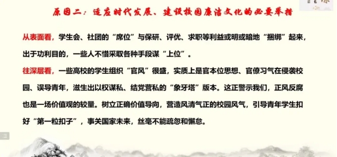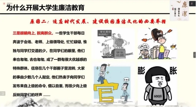 胡博老师以典型事例为据,提出在校园倡导廉洁文化是适应时代发展,是烘托优良校园文化氛围的必要举措。并指出官僚气息误导青年的本质原因是趋名逐利的不良风气,由此提出了推行廉洁文化、引导学生学习廉洁文化对塑造大学生正确的价值观,人生观的重要意义。