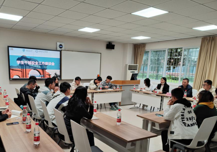 在学生干部安全工作座谈会上,来自本科各年级的学生干部代表与老师们围绕宿舍用电安全、防范电信网络诈骗、促进身心健康等方面进行充分深入的交流。