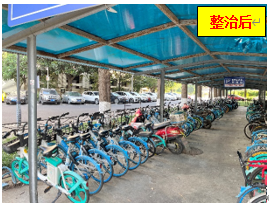 此外,学院还采取了一套组合拳:(1)通过年级大会对学生开展公示公告教育;(2)向学院全体师生发出规范非机动车停放的倡议;(3)制作并摆放警示标识和引导牌;(4)积极联合生命科学与工程学院共同发力;(5)开展日常检查和规整工作。通过多措并举,车棚整治工作效果明显,乱停乱放现象已不复存在,环境整洁层度大幅提升。