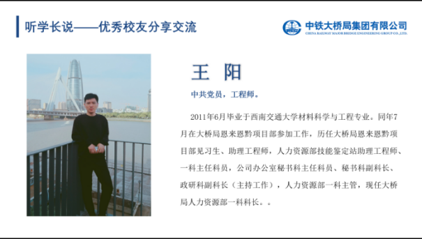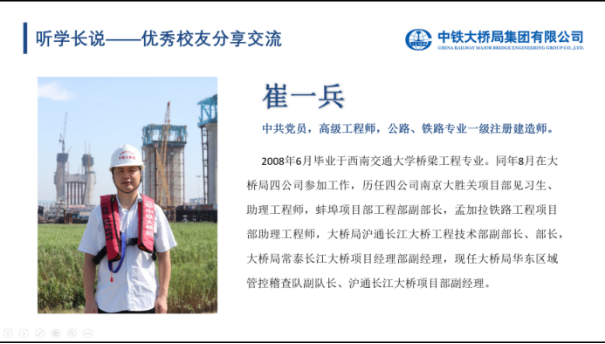 2011届院友王阳学长和同学们进行分享交流。他以时间线为轴,讲述了自己从学校到单位以及在单位内多次调整工作岗位,不断适应新环境、新要求的经历。王阳表示,每一次换岗都是一次挑战,改变和适应成为工作的常态,虽然辛苦但十分充实。他希望大家要敢于走出舒适区,去突破人生更多的可能,遇见更好的自己。王阳指出,人才是企业的核心资源和宝贵财富,并简要介绍了交大人在大桥局工作的基本情况,希望同学们毕业后能选择加入大桥局一起奋斗。王阳学长寄语学弟学妹们,人生难走的往往都是上坡路,吃的每一份苦,终究会照亮人生前行的路。