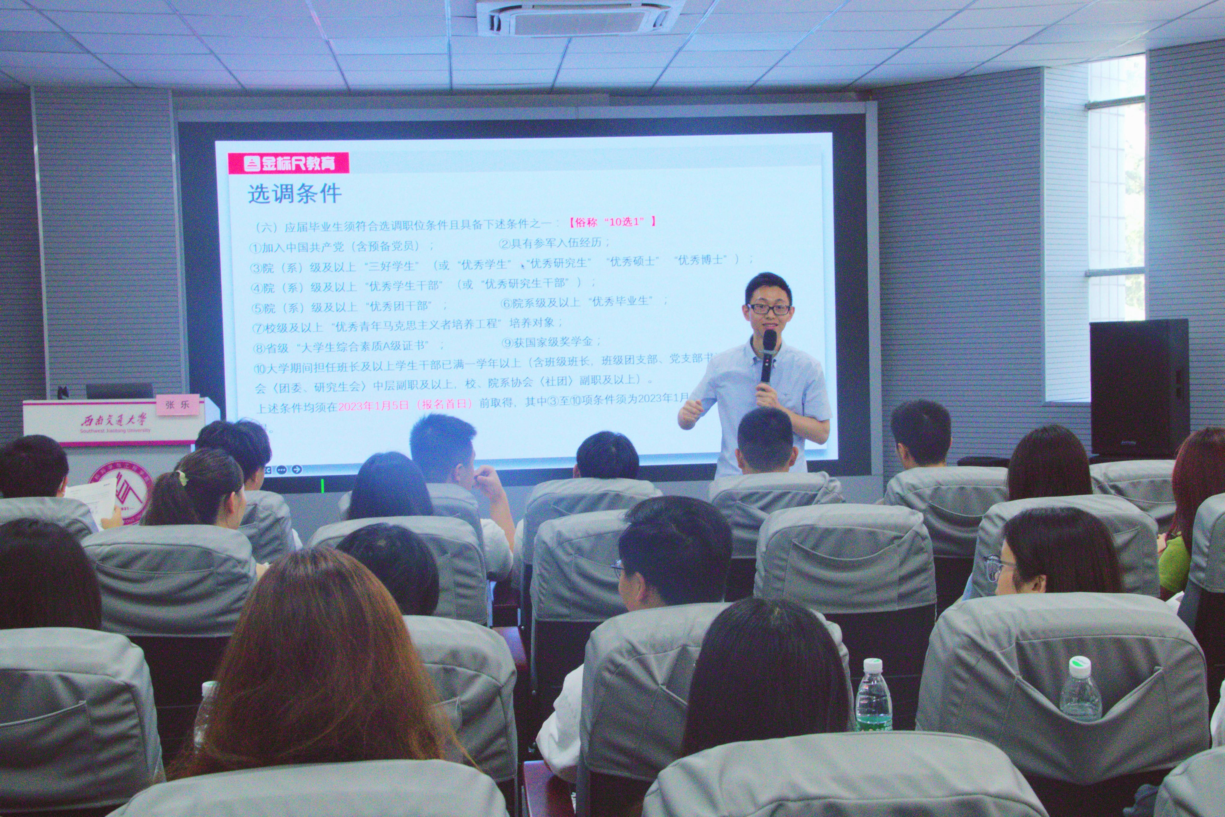 张乐还着重介绍了紧缺选调的相关知识。紧缺选调也称“定向选调”,所谓的“定向”定的是学校:定点招考特定的高校应届毕业生,非特定高校学生不能报考。紧缺选调生相对普通选调生而言,选拔标准更高、培养力度更大、分配岗位更好,张乐也提醒同学们在考虑将选调生纳入到自己未来职业规划时应有的一些准备。如面试方面相关知识,选调生面试形式是结构化面试以及结构化小组,其面试考察能力主要包括综合分析能力、人际交往能力、言语理解表达能力、解决问题能力、应急应变能力和计划组织协调能力等。