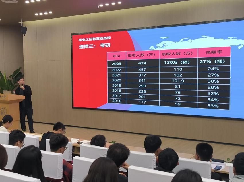 接下来,唐老师介绍了本科生考研以及出国留学的情况,并表示近几年考研报考人数持续上升,形势不容乐观,他鼓励大家从大一起努力学习,提升绩点,并将考研划分为八个阶段,包括准备阶段、基础复习阶段、冲刺阶段等以及各阶段对应时间节点,帮助同学们提前了解考研流程。