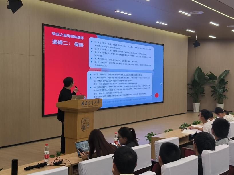 唐老师首先向大家介绍了保研相关流程,从大三下学期的文书材料开始,依次到最终的大四推免系统填报,并展示了一些高校的保研率,引起同学们浓厚的兴趣。此外,唐老师还分享了保研面试的经验,得到了同学们积极的响应。