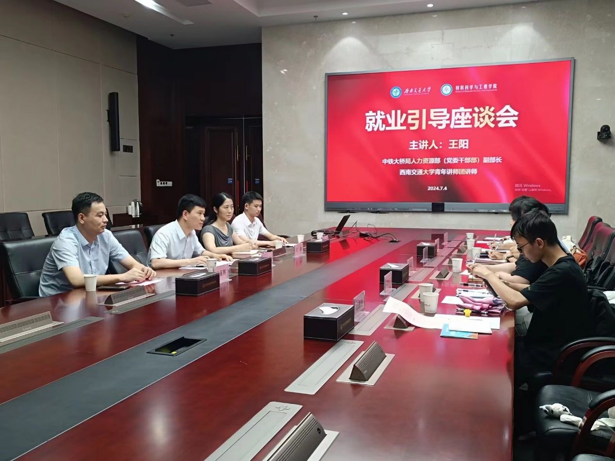 青年讲师团讲师王阳主讲就业引导座谈会。武汉中铁大桥局人力资源部吕静、彭前辉、王吉,学院辅导员、实践队指导老师张琬祺参会。
