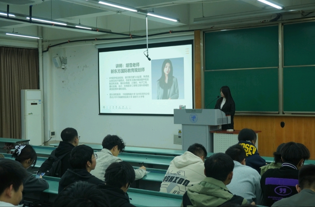 随后,胡雪带来留学规划专题指导。她围绕留学趋势分析、院校选择策略、语言能力提升、申请材料准备等关键问题,进行了系统且翔实的讲解。针对同学们普遍关心的留学成本、专业匹配度、就业前景等疑问,胡雪老师现场答疑解惑,明确大学GPA的重要性,为有留学意向的同学提供了清晰的行动指南,助力大家理性规划海外求学之路。