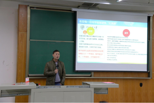 随后是学业安全方面。章春军老师表示"好好学,则机会多多”,并且列举了可参评的评奖评优项目,让同学们对此多一分了解,为将来的评奖评优打下坚实的基础。而对于免研、考研、出国,章春军老师展示了统计图表,根据图表分析当前的形势,进而向同学们展示综合评议加分细则。再之后,章春军老师又展示了学籍处理、学籍预警的数据统计,举了多个具体事例,用一些学长惨痛的教训,告诫同学们,希望同学们能够避免学业的“红黄牌”,以免留下遗憾。