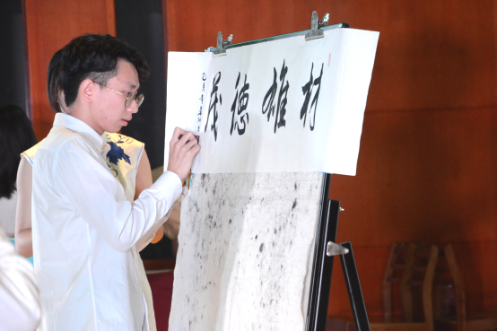 随后,华珅同学在毕业离校感恩学院,献礼学院,现场书写“材雄德茂”赠与学院。笔墨丹青,写不尽材料学子求实创新、知行合一的闪光品质,道不完材料人勇于拼搏,与时俱进的优秀品质。“材雄德茂,爱国荣校”,开学时的迷彩绿似乎还在昨天,而今却已学士服加身,每一位材料人在用自己的四年经历书写着“材雄德茂”的材料精神。