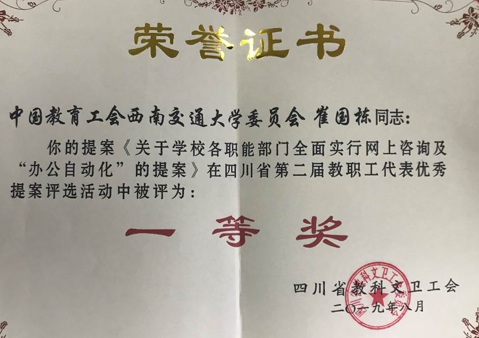 该提案主要结合我校九里、犀浦、峨眉三个校区办学的实际情况而提出,旨在减少教职工在办理教学、科研、管理相关的行政事务时所消耗的时间和精力,借助互联网和先进的信息技术实现三校区行政办公一体化、自动化,提高学校行政办公效率、减轻行政压力。提案提出后得到学校相关部门的高度重视,并积极推进学校的“办公自动化”建设。该项提案在科研、教学、管理等方面已经取得了显著成效,也在推进高校“办公自动化”方面起到了一定的促进和示范作用。