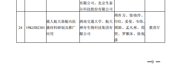 周祚万教授主持的“载人航天器舱内抗菌材料研制及推广应用”荣获2019年度四川省科技进步一等奖。