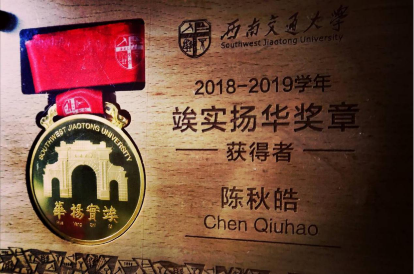 “竢实扬华奖章”。谈起自己对“竢实扬华”奖章的认识,陈秋皓说到:“从奖章本身的制作工艺来讲,冲压成型表面镀金,一般人或许不会思考什么,但这八个字恰好对应了我本科专业(材料成型及控制工程)和研究生深造方向(离子镀膜)。冲压成型使其有了雏形,表面镀金让其更加精美,这也恰恰是本科到研究生的学习历程。从‘竢实扬华’的含义来讲,众所周知其含义为培养人才,振兴中华,也有许多引申的含义,比如扬弃浮华等等。总而言之,竢实扬华奖章是交大最高个人荣誉,蕴含了交大之精神,更是交大之期望。”