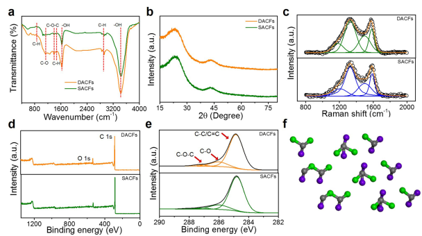 图3. DACFs和SACFs的物理表征。a红外光谱曲线。b XRD谱图。c 拉曼光谱。d X射线光电子能谱。e C1s的分峰。f DACFs的化学键和官能团。