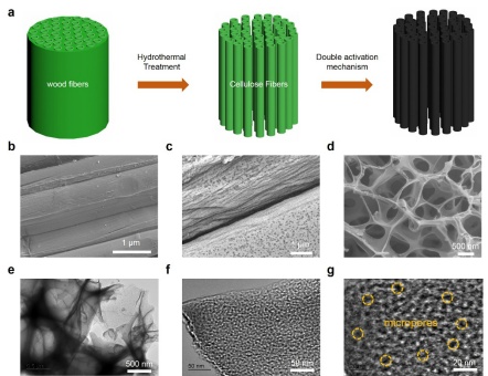 图2. 双活化碳纤维的制备和形貌。a DACFs的合成示意图。b-d 分别为天然苎麻、苎麻纤维的前驱体和DACFs的SEM图像。e DACFs在低倍数下的TEM图像。f,g 具有丰富微孔结构的DACFs的高分辨率TEM图像。