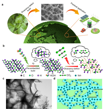 图1. 合理设计双活化碳纤维(DACFs)。a 快速生长和大规模生产的天然苎麻高效的满足储能器件的需求。b DACFs的双空位缺陷效应。c DACFs的代表性TEM图像。d 具有合适的孔径分布和充足的用于离子存储空间的DACFs的示意图