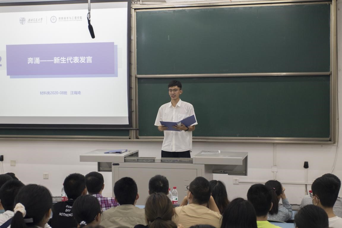 大会第二项,新生代表发言。第一场大会的发言代表是来自材料9班的女生沙依巴·依明江。沙依巴和同学们一起回忆高中生活,展望大学青春,抒发了新生对大学生活和未来的憧憬和期待。第二场大会的发言代表是来自材料8班的男生汪瑀琦。汪瑀琦同学和同学们回顾校史辉煌,感叹中国发展成就,展现了时代青年的满腔爱国热情。他们的发言,让学院领导和老师们感受到了青年学习的朝气蓬勃,看到了交大复兴和民族复兴的无限希望。