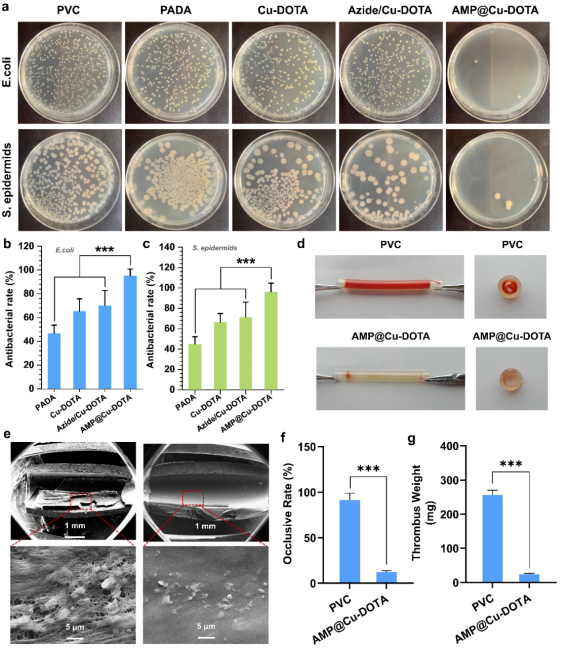 熊开琴工程师与杨志禄研究员联合成都市第三人民医院心内科周名纲副主任医师,从血管内膜及其微环境仿生设计出发,通过点击化学的方法,构建了一个具有双功能仿生的涂层,用于医用导管内表面的改性,以期解决医用导管在临床运用中导致的凝血与细菌感染等问题 (图1)。在这项设计中,为了充分提供功能分子的接枝位点,预先在导管表面制备富氨基涂层(PADA),之后,将催化NO生成的Cu2+螯合DOTA和内膜微环境中重要的抗菌分子——抗菌多肽(ABP)通过酰胺缩合与点击化学接枝两种方式分别固定在PPAm涂层上。具体地说,首先富含大量氨基的聚烯丙胺(PAa)分子以席夫碱反应和迈克尔加成方式接枝在聚多巴胺涂层表面,从而制备富氨基涂层(PADA)。利用大环多胺(DOTA)对CuII高度螯合作用,制备出CuII-DOTA 配合物,然后通过酰胺缩合反应将CuII-DOTA配合物和Azide(15-叠氮基-4,7,10,13-四氧十五烷酸,其水解后含有羧基和叠氮基团的分子)接枝到在富氨基涂层上,最后通过点击化学反应接枝抗菌多肽。相比较酰胺缩合反应固定,点击化学策略通过“钥匙-锁”的专一结合方式进行分子间的键合,实现了高选择性、近乎完美的可靠性和高收率的特点,并且有效避免了功能分子在接枝时发生失活和设计失败。