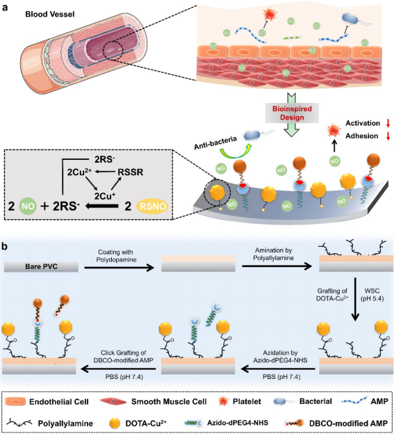 临床上,聚氯乙烯材质的导管在药物输送和体外循环中得到了广泛的运用。然而在长期运用中,其导致的细菌感染与凝血等症状,对患者造成了诸多负担。然而,目前的治疗手段,如使用抗生素与抗凝药物,会导致滋生耐药菌,诱导出血等并发症。因此,对导管进行内表面功能化设计,博得了许多科研人员的青睐。但是,目前常用的功能设计,更多的依然局限于药物包载,或是被动抗黏附等功能,并没有有效解决细菌滋生以及长程的功能实现。相比较聚氯乙烯材料,正常人体内血管内膜微环境中存在着丰富的抗菌多肽,可以有效清除微生物,进而防止细菌黏附形成生物膜和感染;同时,内膜中的内皮细胞会分泌多种信号分子,保持正常的血液流动。因此,人体正常血管具有一定的抗凝血与抗菌的功能,这也为设计导管的功能表面提供了思路。