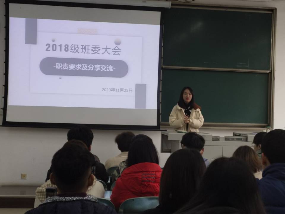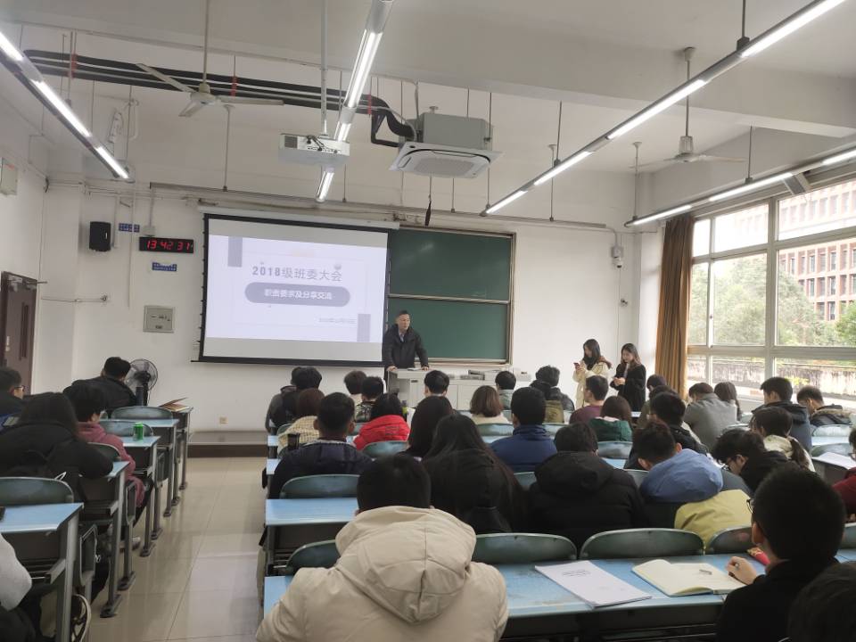 党委副书记、纪委书记、学生工作组组长章春军,2018级辅导员梁喻嘉、罗丹,以及2018级各班班长,团支书。首先,梁喻嘉老师向同学们介绍了本次活动的主题:做好班团建设,加强学风建设。