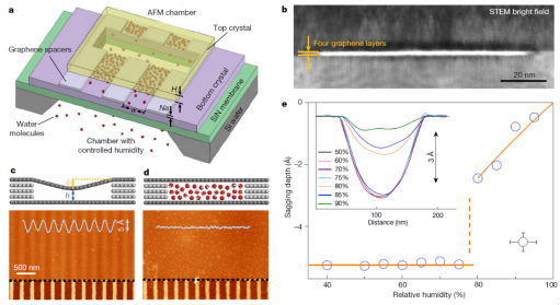 来自曼彻斯特的研究者们通过长时间的努力,采用具有原子级别光滑表面的云母和石墨二维晶体,通过将具有一定原子层数的二维晶体堆叠在两层晶体间,得到了具有原子级别光滑表面的纳米通道,最小的通道只有1个原子层高度,只能容纳一层水分子。该工作证明即使在这样最小的通道里,开尔文方程依旧适用。这是一个很意外的结果,甚至和我们的认知相违背,因为在这么小的维度里,连水分子的结构都是离散的层状结构。“这对我来说很意外,我们期望的是传统理论失效”本文的第一作者杨倩博士说到,“但这个有着百年历史的方程居然依旧成立”;她提到,开尔文方程这种良好的适用性,也同样是偶然的。在发生毛细凝聚的纳米通道中通常会产生超过1000个大气压的负压,超过深海海底的压力,如此巨大的压力可以使通道发生埃 (1埃 = 0.1 nm) 级别的尺寸调整,而这就能够使通道只容纳整数层水分子。正是由于这样的细微调整,使得开尔文方程具有了在该尺度下的广泛适用性。