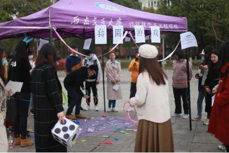 线下活动于3月7日下午14时在图书馆东广场开展,随着主持人宣布活动正式开始,各大学生社团依次登台表演精彩纷呈的节目,同学们踊跃参加游戏,获得奖章,参与抽奖,在心愿卡上写下心愿和祝福。