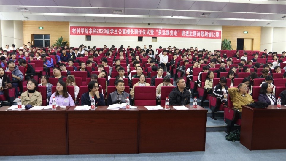 党委副书记章春军、材料先进技术教育部重点实验室副主任苟国庆、学院分析测试中心常务副主任郑晓彤、学院组织员兼党务秘书严翼飞,各系教工党支部书记兼系主任翁亚军、朱宗涛、樊小强、孟凡彬,以及2020级专业导师刘建华、杨炜沂应邀出席聘任仪式。学工组辅导员黄德明、熊苏雅、郑纪伟、许欢、梁喻嘉、董海霞、杨婷以及2020级全体本科生参加了此次活动。学工组副组长黄德明主持聘任仪式。