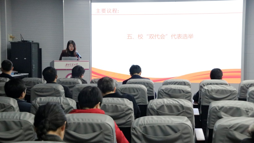 会议由院工会第五届委员会副主席涂秋芬同志主持。除了因出差等事由请假的学院“双代会”10名代表,学院“双代会”38名代表出席本届大会。相关领导和老师应邀列席。