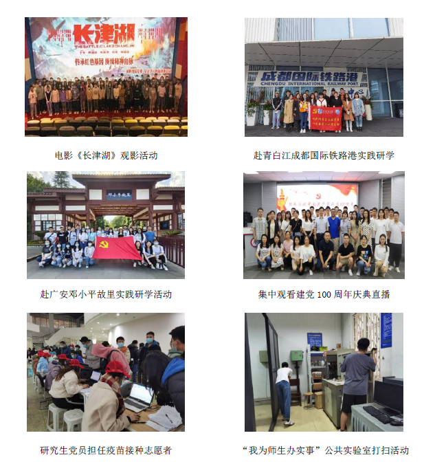 过去几年,学院学生工作组以“守好安全底线,强化思政引领,营造学术氛围,注重全面发展”为研究生工作主要目标,不断加强思政队伍建设,建立协同育人机制,争做研究生成长成才的贴心人、暖心人,为学院研究生培养做好教育服务工作。下面以2021年研究生工作为例,对研究生党建和思政工作进行展示(部分)。