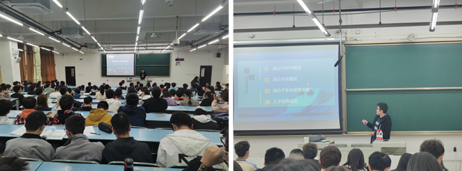 宣讲会分五项内容进行,包括高分子材料概述、高分子材料系介绍、高分子专业培养方案介绍、人才培养成效介绍以及师生互动交流。首先,祁晓东老师从高分子材料结构特点、应用场景、人才需求等方面进行了详细讲解,他提到高分子材料已渗透于生活的方方面面,并给现代社会带来便捷化、高效化和智能化,从高分子产业全球产量、发展趋势到高分子材料对高技术人才需求等现象表明高分子材料专业具有很好的发展前景,选择高分子材料专业必将大有可为。