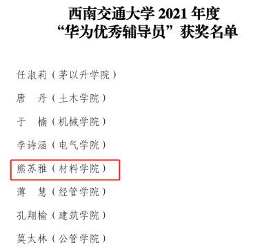 “华为优秀辅导员”是我校为表彰政治信念坚定、业务能力过硬、思想政治教育和管理工作有特色有亮点的先进辅导员个体而设立的学生工作干部荣誉,每年评选1次,旨在引导全校辅导员做“四有”好老师,当好学生“四个引路人”,鼓励全校辅导员朝着专业化职业化专家化方向成长发展。