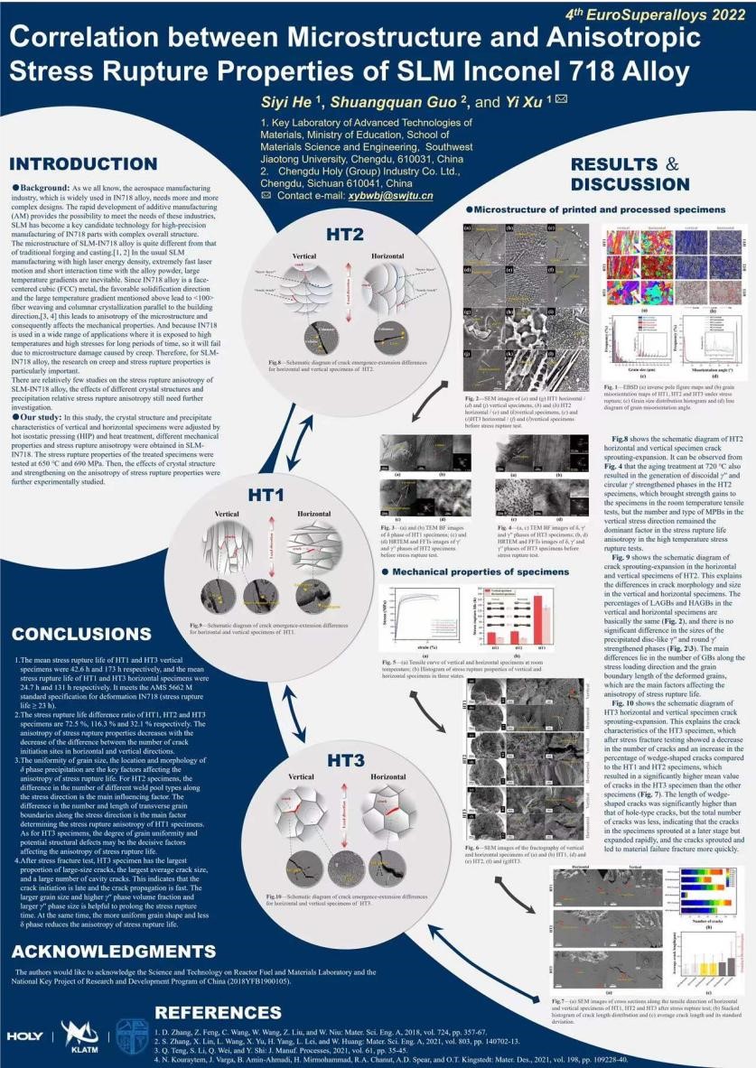徐轶团队与空军装备部首席专家/天府科技菁英郭双全博士团队联合培养的硕士生何思逸,目前从事3D打印高温合金性能调控研究,其中IN718高温合金经过组织调控后,室温拉伸,高温拉伸和高温持久等试验性能,在无热等静压条件下,已全面达到锻件技术要求。研究成果投稿金属材料领域顶级期刊1篇,并将在2022年欧洲高温合金年会做学术交流报告,毕业后也将继续从事航空发动机材料与技术的相关研究工作。