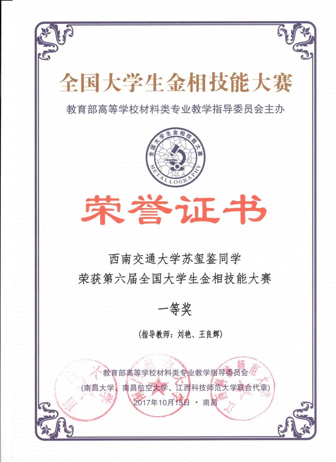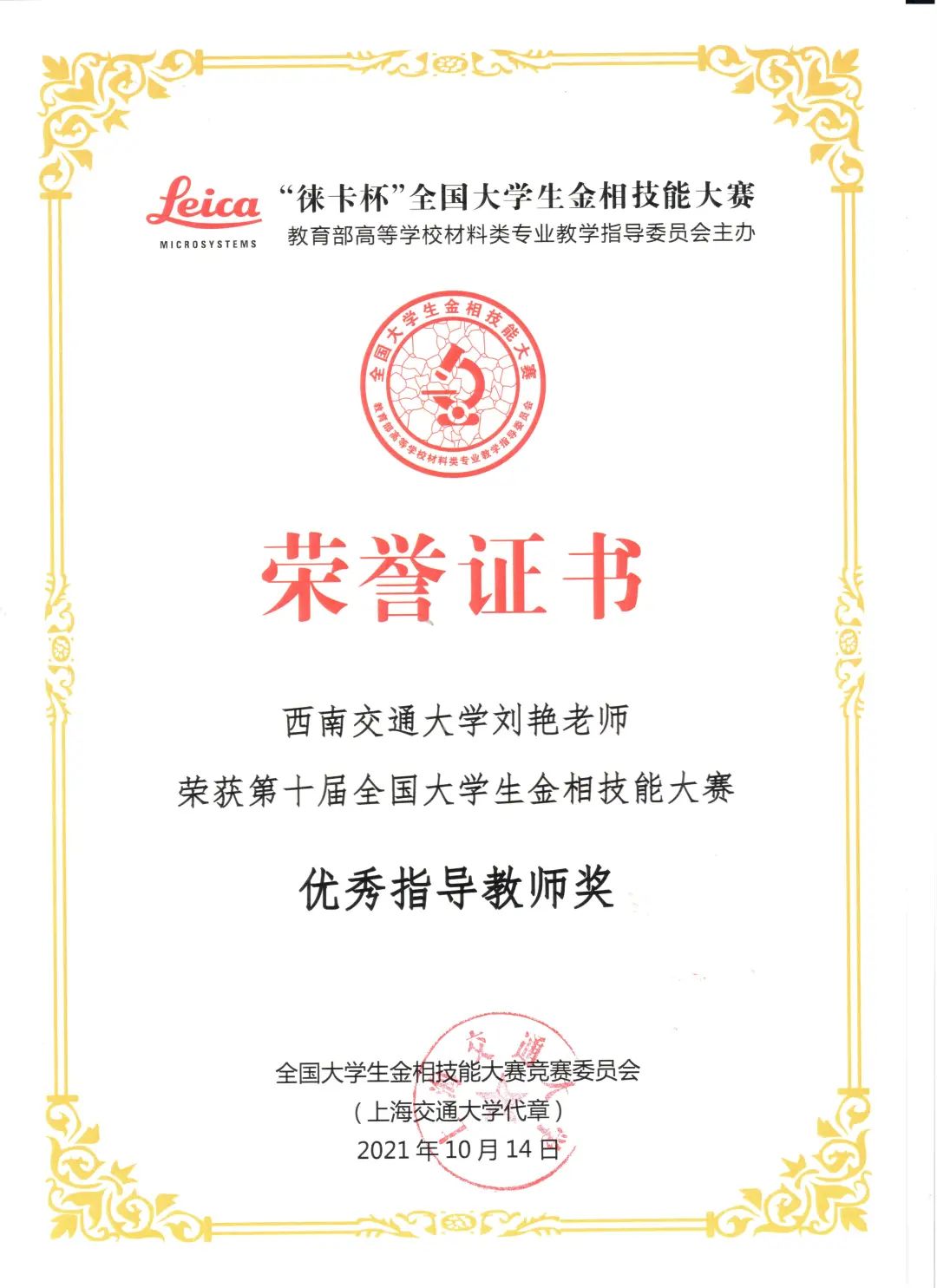 作为一名党员教师,她重视并投身本科教学,自2009年入职以来,担任了2门理论课程和4门实践课程的主讲教师,认真上好每一门课。同时,刘艳老师乐于担任各项学科竞赛指导教师,并积极鼓励学生通过参加学科竞赛来开拓视野、提升能力。近年来,她指导的学生在各类创新实践比赛中取得丰硕成果:指导学生获第三届全国“互联网+创新创业大赛”银奖1项;获第六届“徕卡杯”全国大学生金相技能大赛一等奖、二等奖、三等奖各1项、第七届“蔡司·金相学会杯”全国高校大学生金相大赛特等奖1项并荣获优秀指导教师称号;获全国大学生焊接创新大赛一等奖和二等奖各1项。