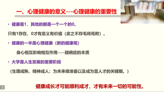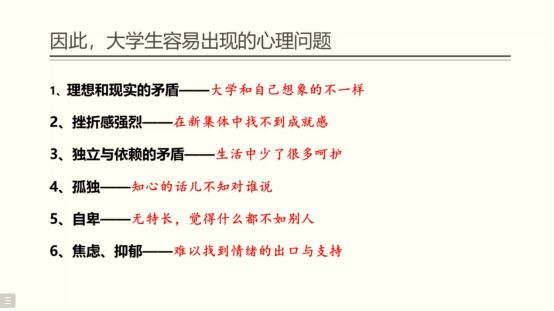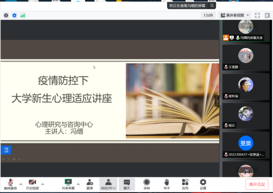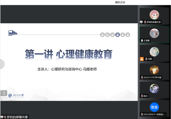 冯缙老师首先通过线上互动形式,调动同学们的积极性,在老师的提问得到同学们的热情回应后,冯老师对同学们表现出积极向上的态度予以肯定,并将讲座的内容有侧重的调整为帮助大家适应新环境里的新角色。她表示同学们在身份转变后,来到新的环境,有很多需要适应的地方,在某些时候同学们感到迷茫焦虑孤独甚至不合群,都是很正常的情绪。在这种情况下,拥有更多正向的心理健康知识作为支持,对于同学们来说具有重要意义。