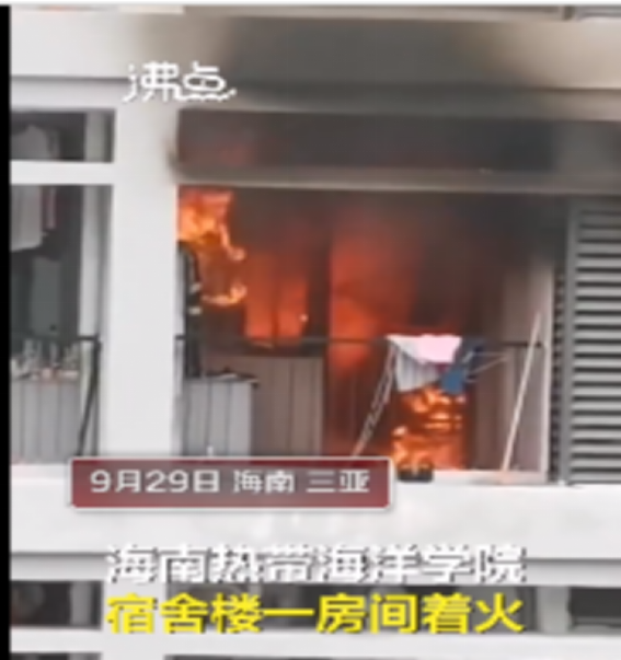 2020年9月29日,位于三亚的海南热带海洋学院宿舍楼着火。学校后勤工作人员称,疑似学生使用电器不当造成火灾,火势一度凶猛,所幸没有造成人员伤亡。