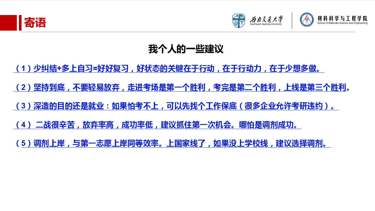 二是为大家分析了“二战”的诸多不利因素,要求同学们认真评估“二战”,他指出随大流或逃避就业的被动二战不可取,他鼓励同学们现阶段最重要的事是认认真真复习,他建议个别放弃考研的同学要积极就业。