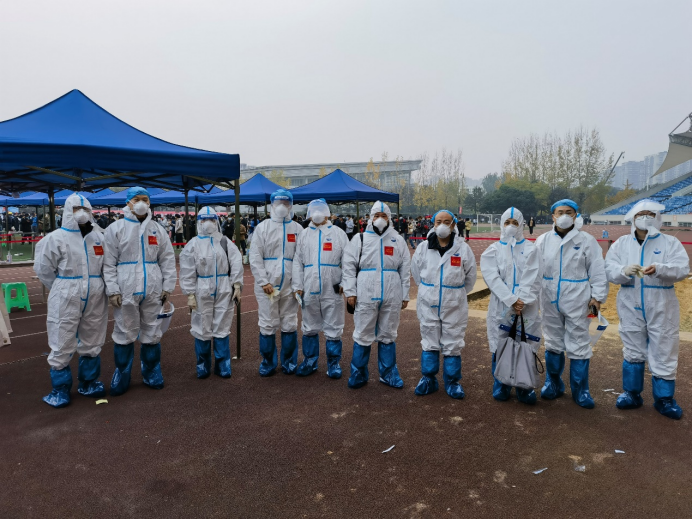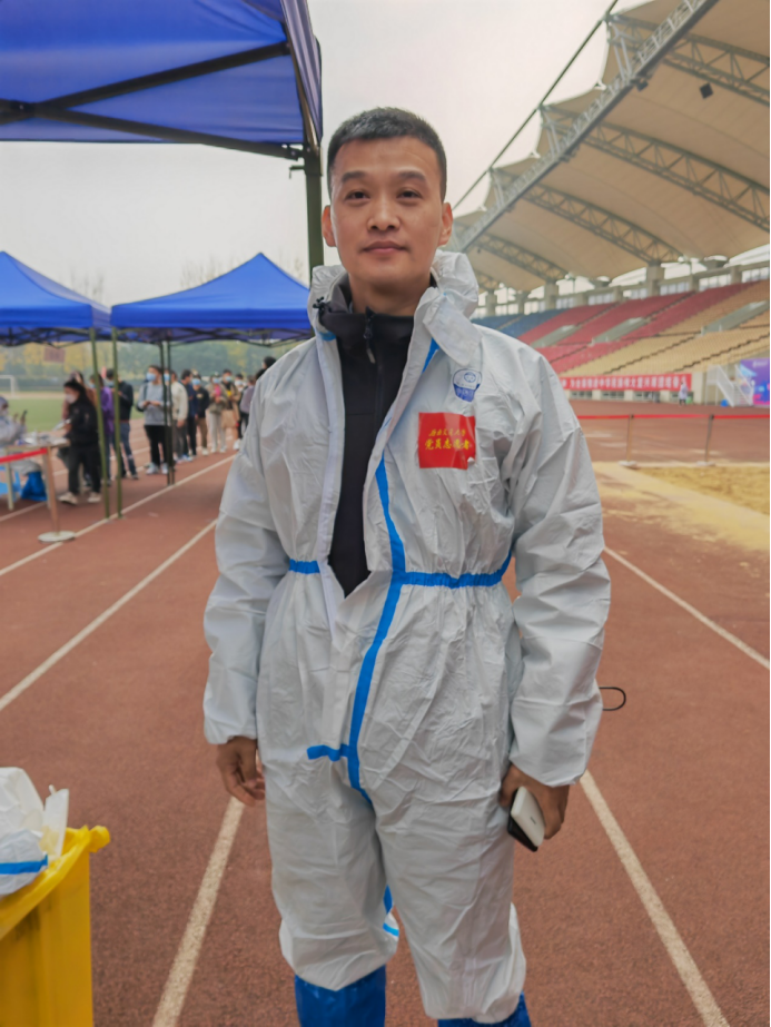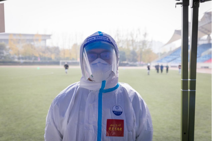 14名教职工担任了11月24日校内核酸检测志愿者,在犀浦校区北区田径场协助核酸检测扫码等工作。
