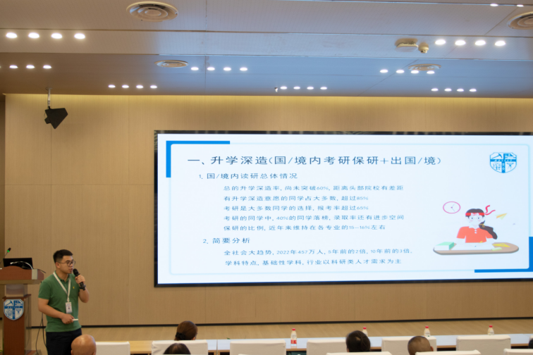 郑纪伟围绕“大学学业、课外活动、校园安全、心理健康、升学就业”向家长们介绍了当前大学生的学习生活情况,详细分析了近两年毕业生的就业去向,强调要格外关注日趋严重的大学生心理健康状况。针对当前学生教育管理中普遍存在的问题,郑纪伟为家长们介绍了学院的针对性举措和成效。郑纪伟表示,希望与家长们加强沟通和支持,形成育人合力,共同为学生的成长导航。
