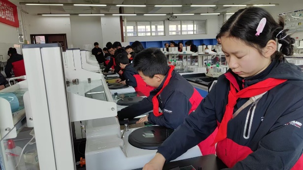 活动中,中心高级实验师王良辉老师带领同学们参观显微互动实验室、制样室、硬度光电实验室、磁学实验室以及热学及力学性能实验室,介绍了实验教学示范中心的历史沿革以及所承担的学校本科实验教学课程,结合《材料科学基础实验方法》实验课程讲述了金属材料微观显微镜的原理、操作方法,现场指导同学们磨金相并观察微观下的材料世界。