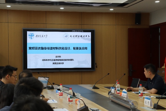 随后,马栎助理教授代表电磁功能材料团队汇报了团队的研究方向与发展规划,重点介绍了在吸波涂层、吸波超材料、轻质耐高温复合材料及电磁屏蔽一体化设计等方面的最新进展。团队博士生侯洪波围绕“匀质热塑性聚酰亚胺吸波复合泡沫制备技术开发”项目作专题汇报,展示了团队在微观结构调控、宽频吸收性能优化及批量化制备方面的阶段性成果。