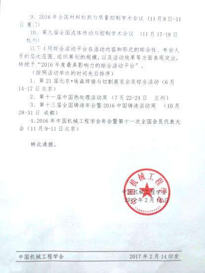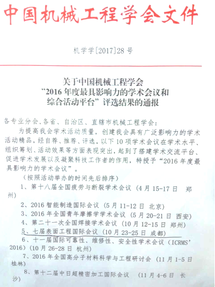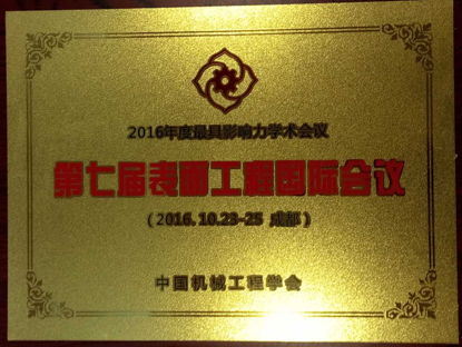 承办的“第七届表面工程国际会议”被评选为“2016年度最具影响力的学术会议和综合活动平台”。